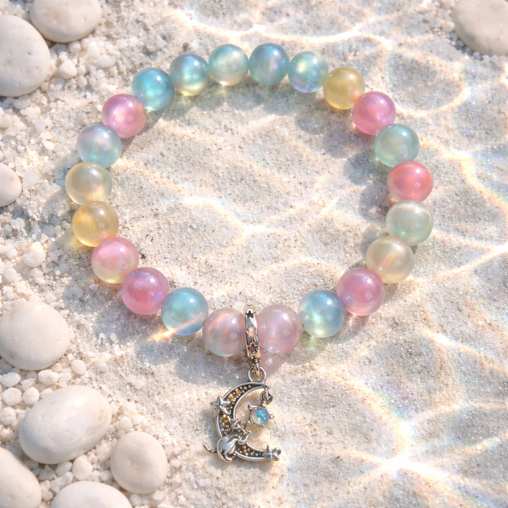 Surrounding the charm are shimmering blue and pink glass beads, glowing like twilight clouds drifting across a starlit sky. The blue beads bring a sense of calm and cosmic depth, while the pink beads add a soft, uplifting radiance. Together, they create a gentle, celestial shimmer that shifts beautifully with every movement.