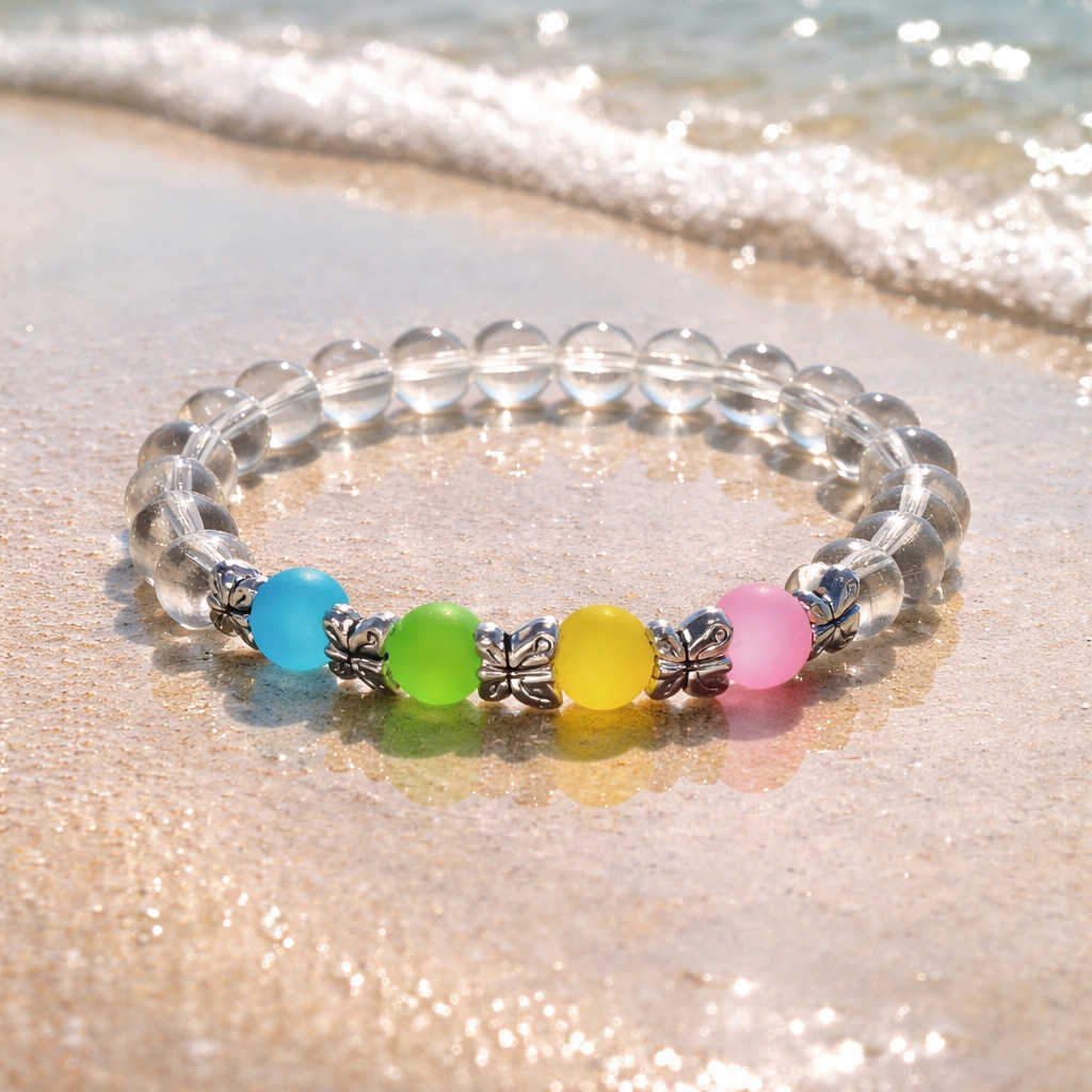 Four frosted beads—blue, green, yellow, and pink—add a whisper of color, each representing a different emotional note: calm, renewal, joy, and love. Between every color rests a delicate silver butterfly, a symbol of transformation, hope, and new beginnings.